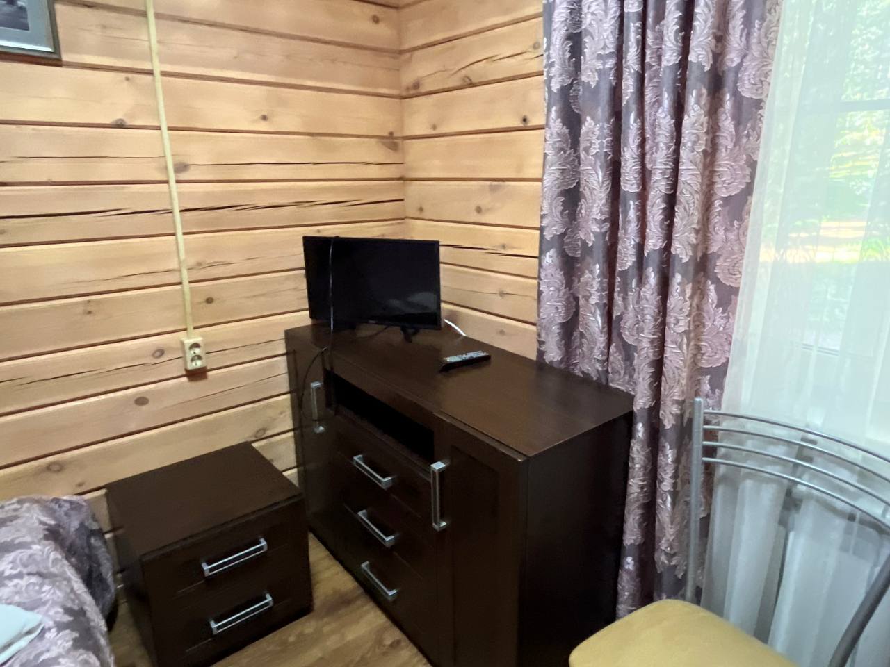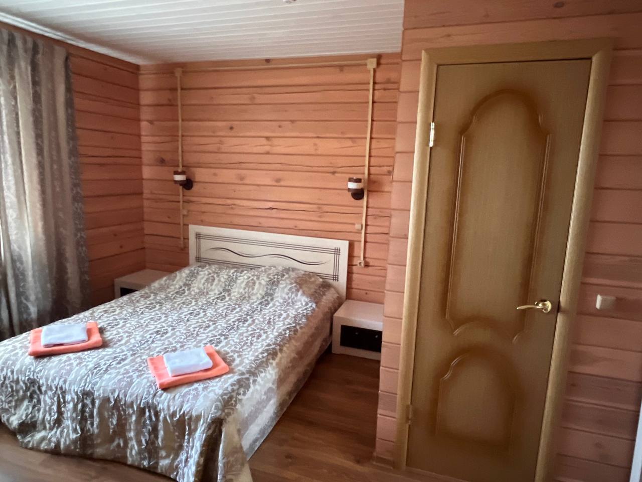 Коттедж включает четыре просторные комнаты, каждая из которых оборудована удобными кроватями и мебелью для хранения вещей. В комнатах есть как односпальные, так и двуспальные кровати, что позволяет гибко организовать размещение гостей. Интерьеры выполнены в уютном деревянном стиле, создающем теплую атмосферу загородного отдыха.