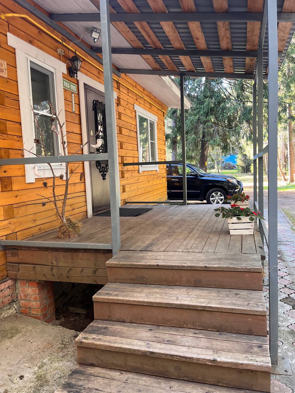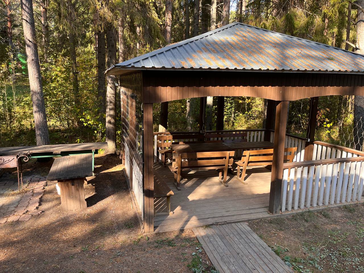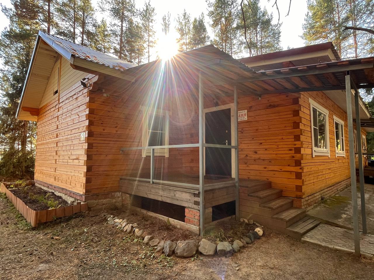 Коттедж расположен в окружении соснового леса, предлагая уникальную возможность провести время на свежем воздухе. Просторная терраса перед домом прекрасно подойдет для вечерних посиделок или утреннего кофе.