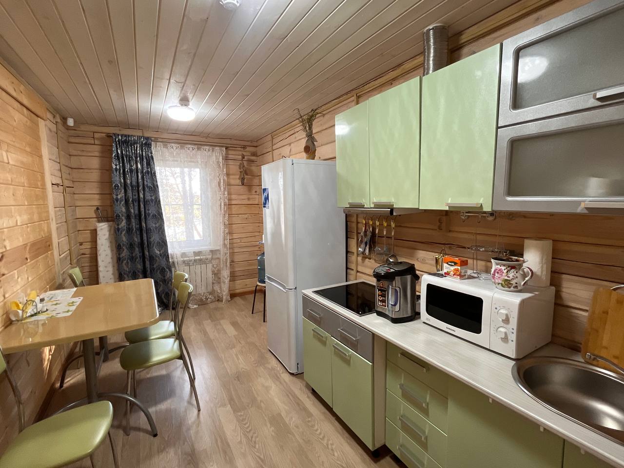 На кухне коттеджа установлены все необходимые бытовые приборы: плита, микроволновая печь, чайник, холодильник и вся необходимая посуда. Здесь можно готовить и проводить время за обеденным столом с семьей и друзьями.