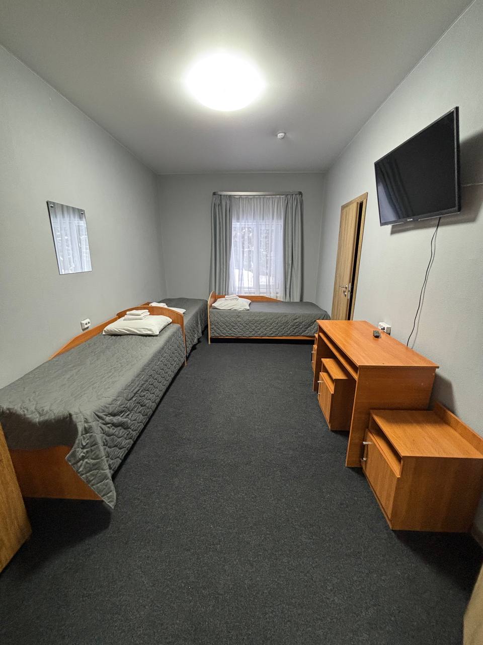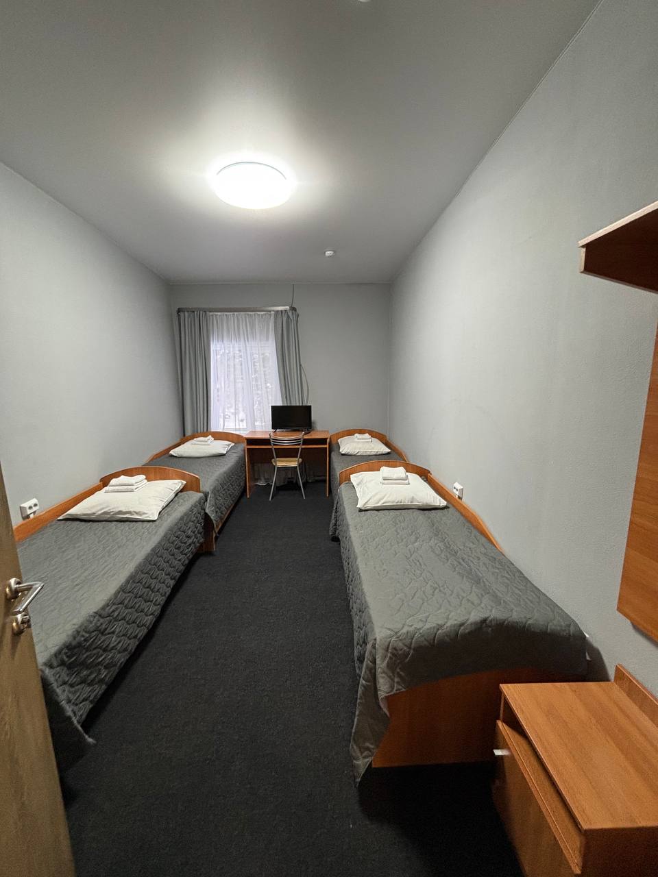 Корпус включает восемь отдельных спален, каждая из которых оборудована односпальными кроватями и необходимой мебелью для хранения вещей. В каждой спальне есть телевизор, что обеспечивает удобство и приватность для всех гостей. Интерьеры выполнены в теплых тонах, а большие окна выходят на лес, создавая ощущение близости к природе.